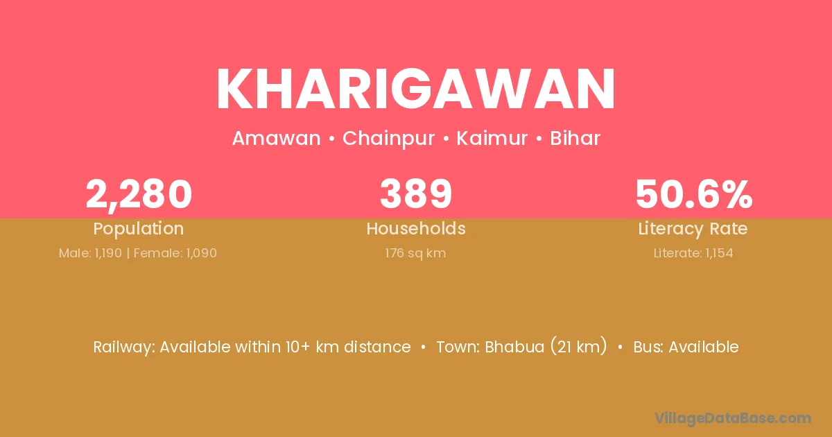 Bhabua (21 km) is the nearest town to Kharigawan village for major economic activities and is located approximately 21 km away.