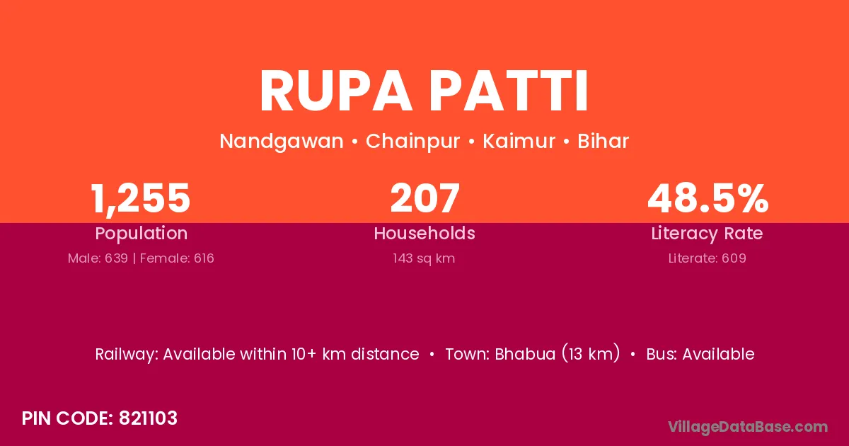 Bhabua (13 km) is the nearest town to Rupa Patti village for major economic activities and is located approximately 13 km away.
