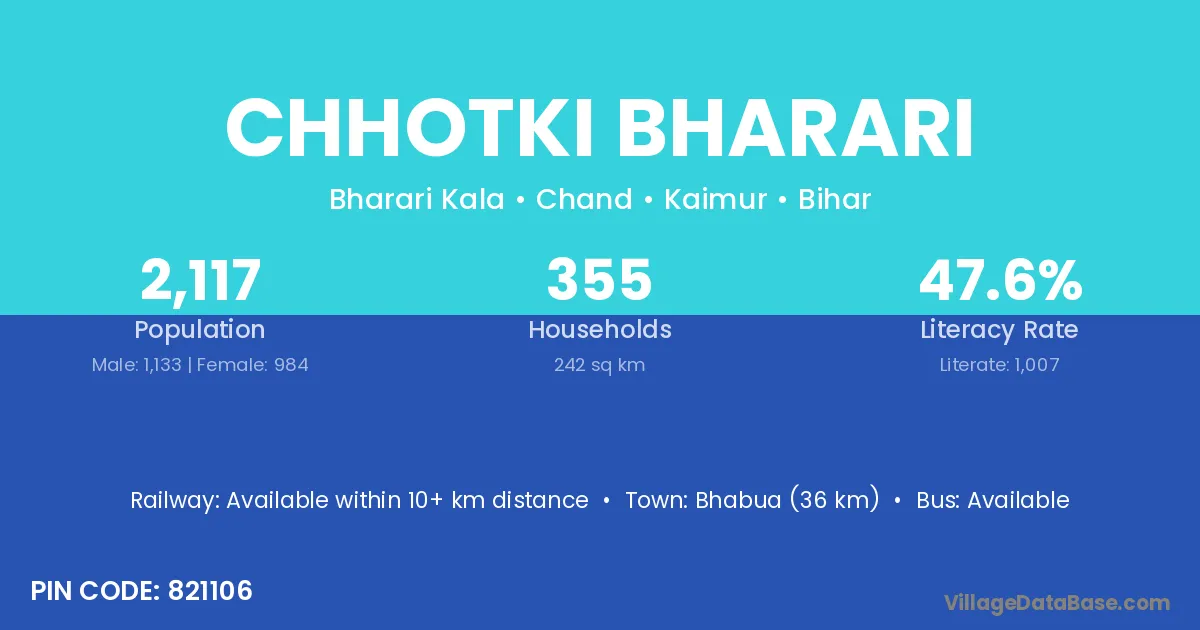 Chhotki Bharari village has a total population of 2,117 people, of which 1,133 are males and 984 are females.