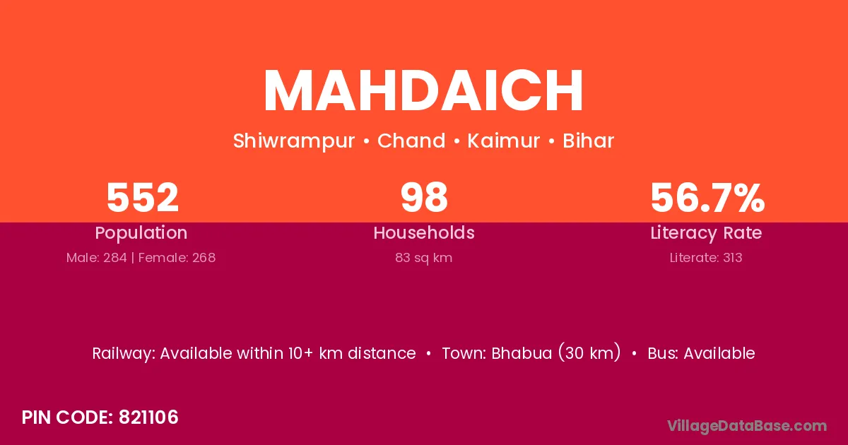 Bhabua (30 km) is the nearest town to Mahdaich village for major economic activities and is located approximately 30 km away.