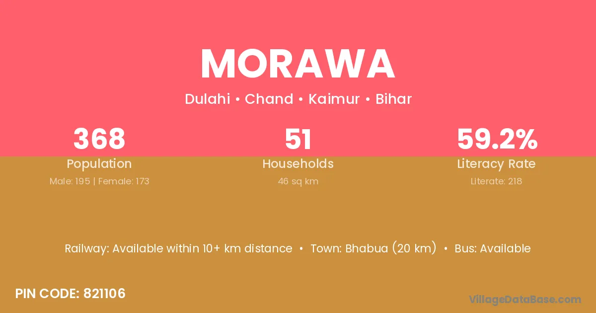 Bhabua (20 km) is the nearest town to Morawa village for major economic activities and is located approximately 20 km away.