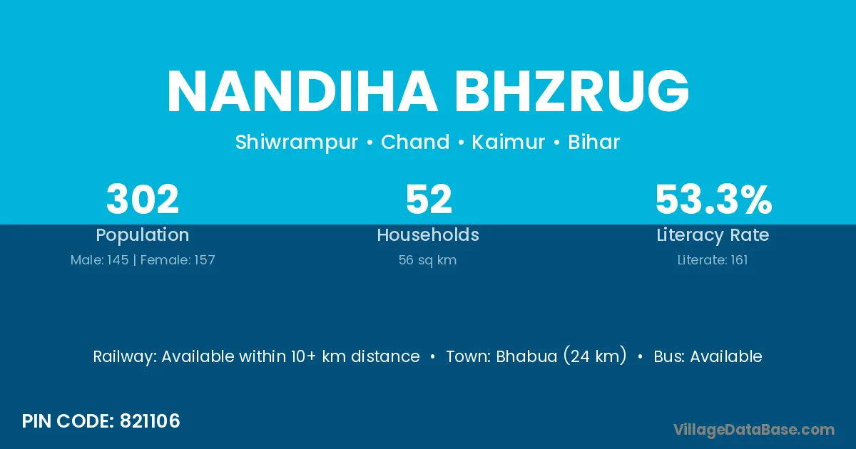 Bhabua (24 km) is the nearest town to Nandiha Bhzrug village for major economic activities and is located approximately 24 km away.