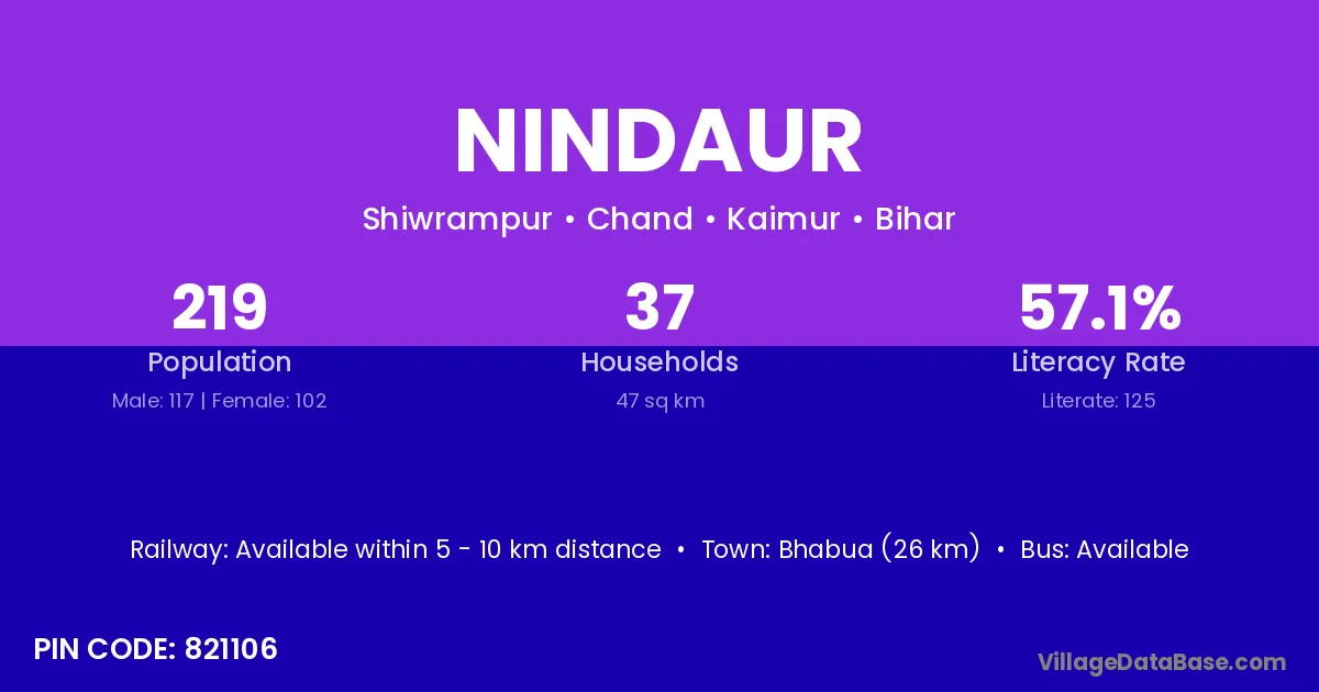 Bhabua (26 km) is the nearest town to Nindaur village for major economic activities and is located approximately 26 km away.