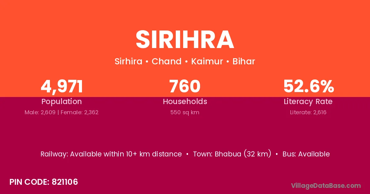 Bhabua (32 km) is the nearest town to Sirihra village for major economic activities and is located approximately 32 km away.
