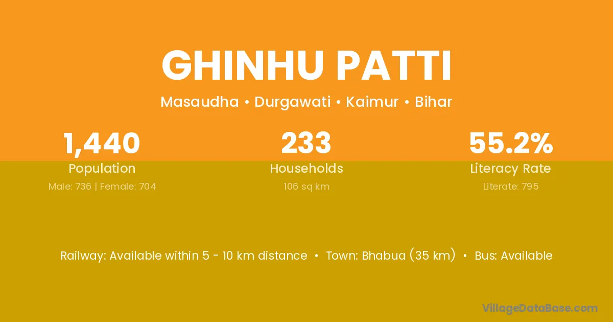 Bhabua (35 km) is the nearest town to Ghinhu Patti village for major economic activities and is located approximately 35 km away.
