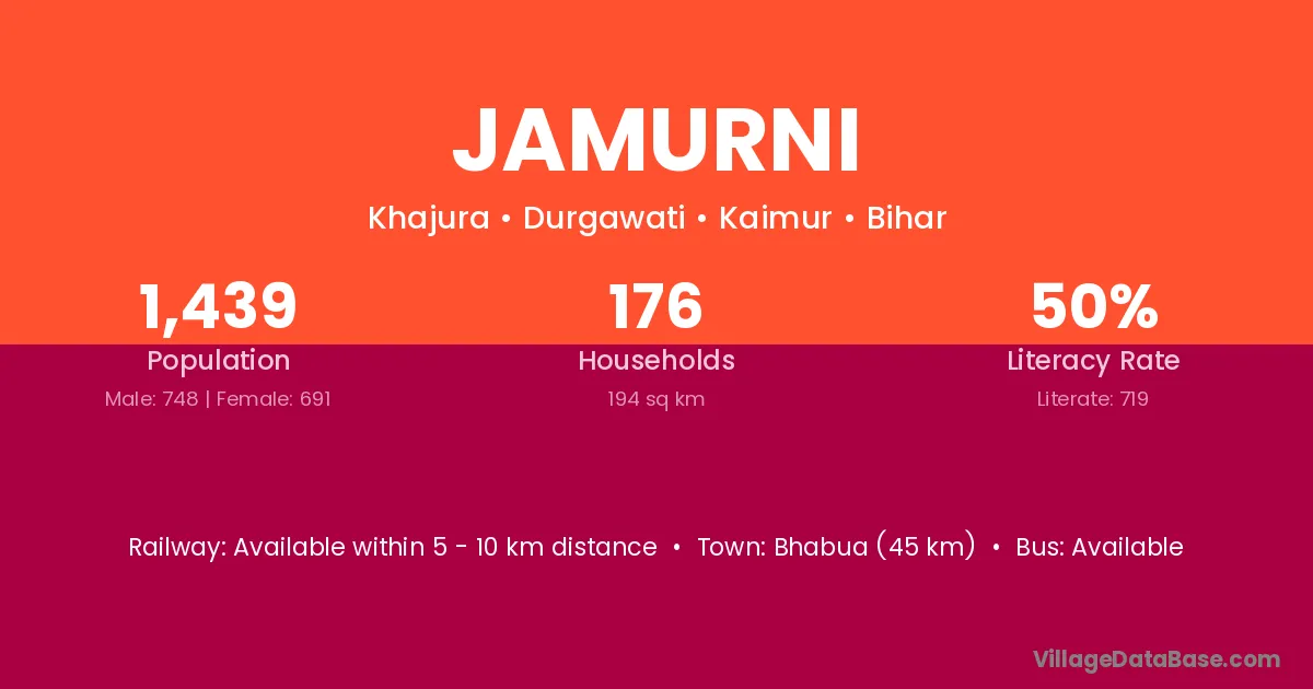 Bhabua (45 km) is the nearest town to Jamurni village for major economic activities and is located approximately 45 km away.