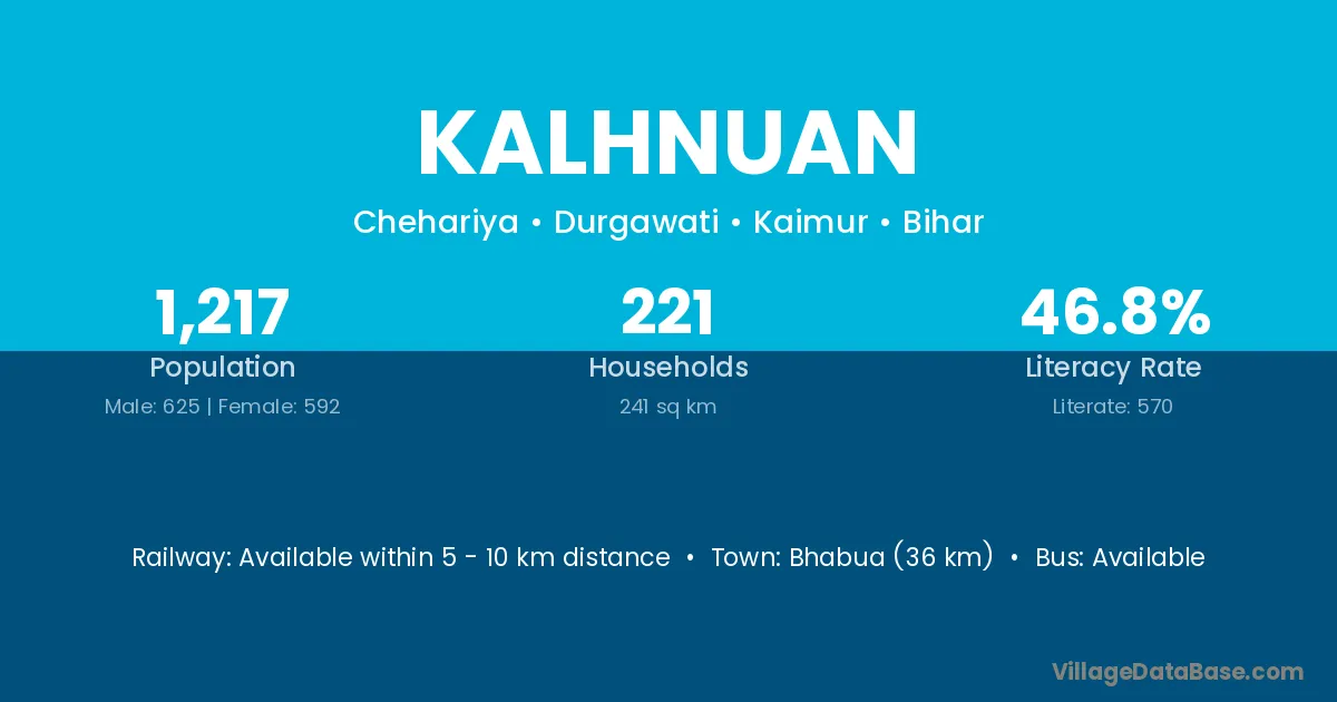 Bhabua (36 km) is the nearest town to Kalhnuan village for major economic activities and is located approximately 36 km away.