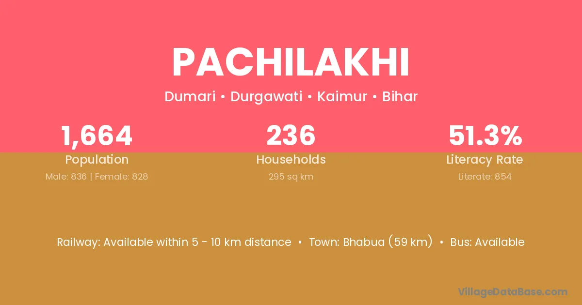 Bhabua (59 km) is the nearest town to Pachilakhi village for major economic activities and is located approximately 59 km away.