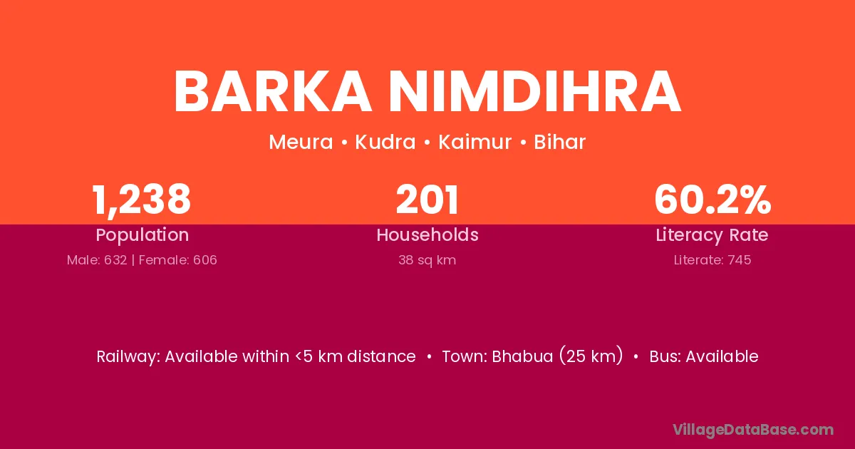 Bhabua (25 km) is the nearest town to Barka Nimdihra village for major economic activities and is located approximately 25 km away.