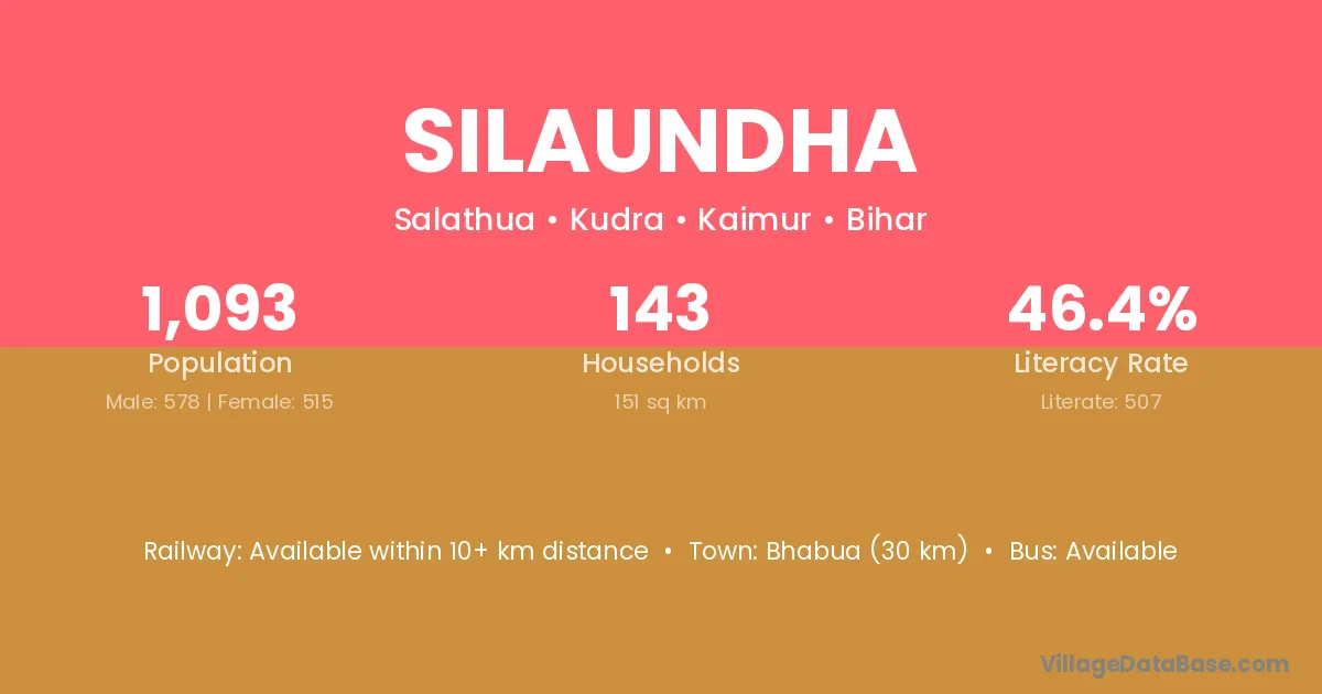 Bhabua (30 km) is the nearest town to Silaundha village for major economic activities and is located approximately 30 km away.