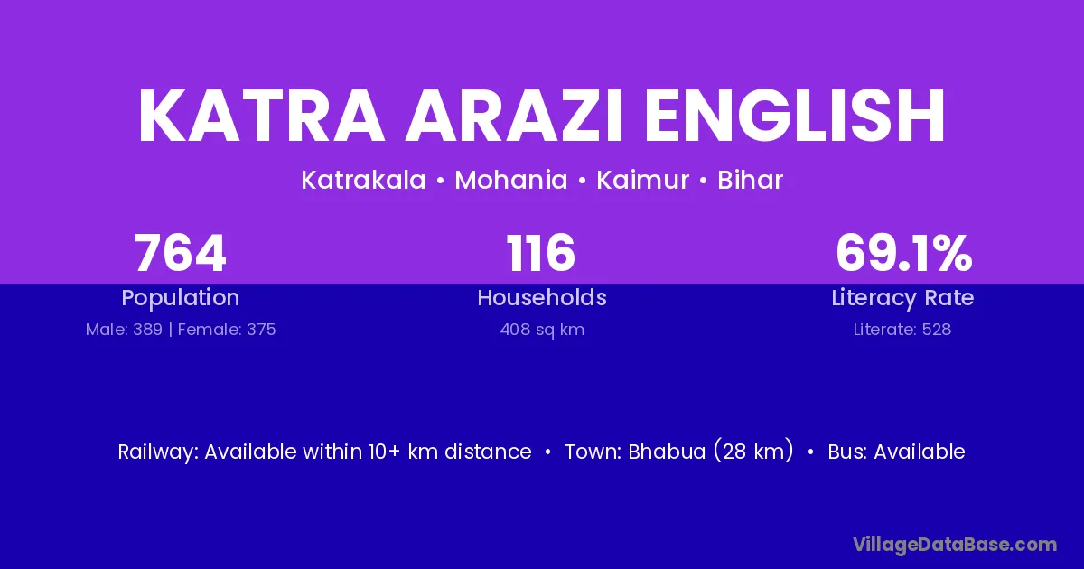 Bhabua (28 km) is the nearest town to Katra Arazi English village for major economic activities and is located approximately 28 km away.