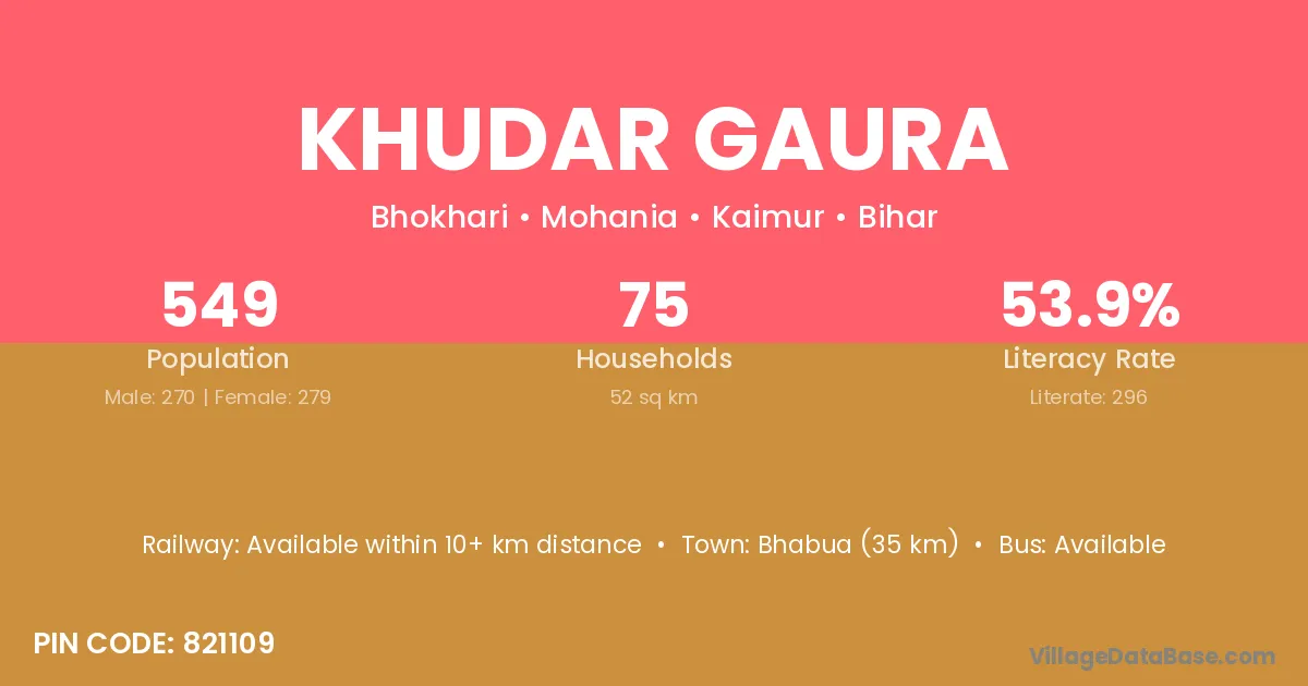 Bhabua (35 km) is the nearest town to Khudar Gaura village for major economic activities and is located approximately 35 km away.