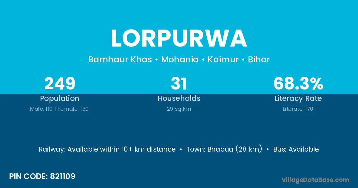 Bhabua (28 km) is the nearest town to Lorpurwa village for major economic activities and is located approximately 28 km away.
