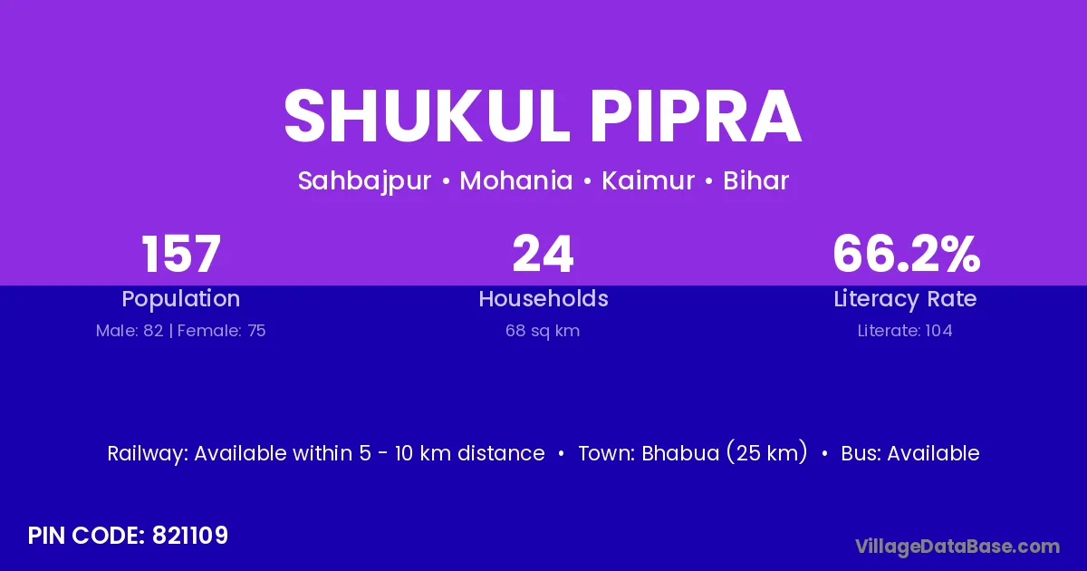 Bhabua (25 km) is the nearest town to Shukul Pipra village for major economic activities and is located approximately 25 km away.