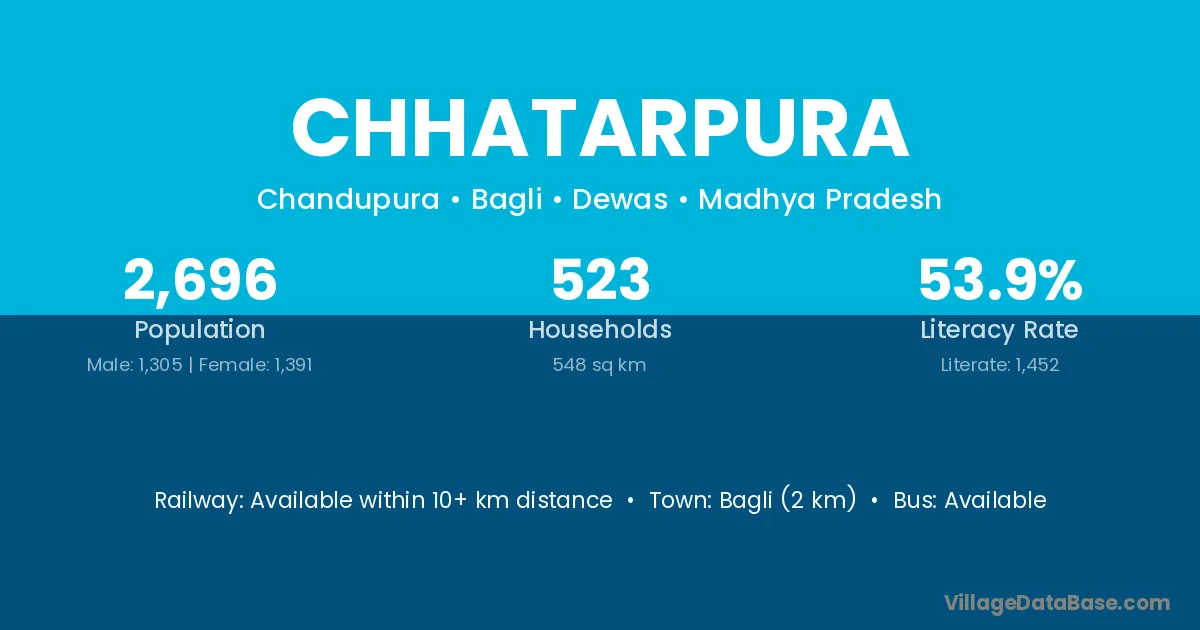 Bhabua (32 km) is the nearest town to Chhatarpura village for major economic activities and is located approximately 32 km away.