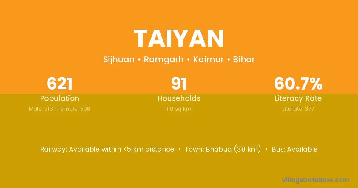 Bhabua (38 km) is the nearest town to Taiyan village for major economic activities and is located approximately 38 km away.