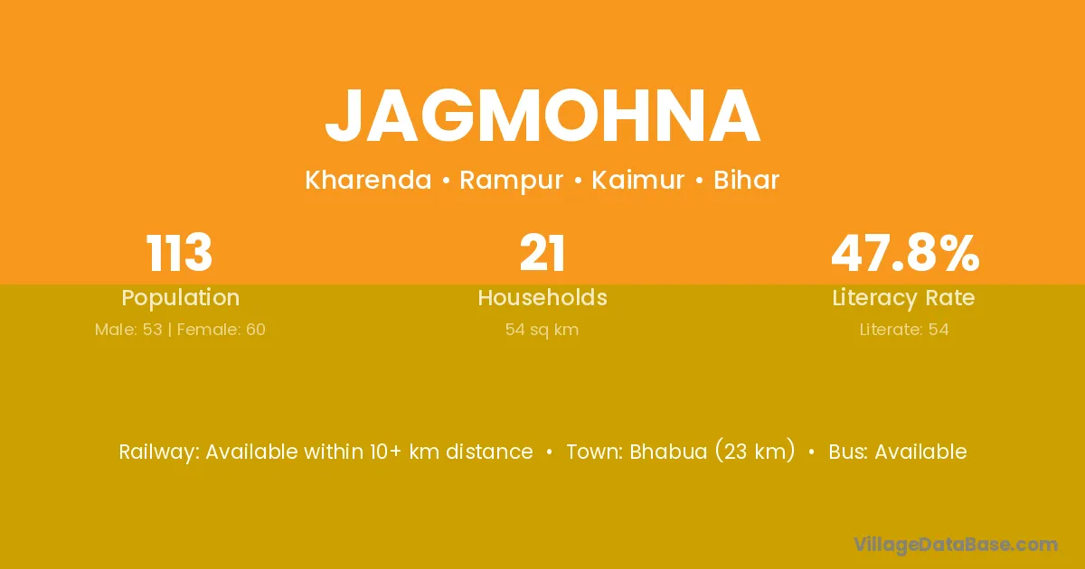 Bhabua (23 km) is the nearest town to Jagmohna village for major economic activities and is located approximately 23 km away.