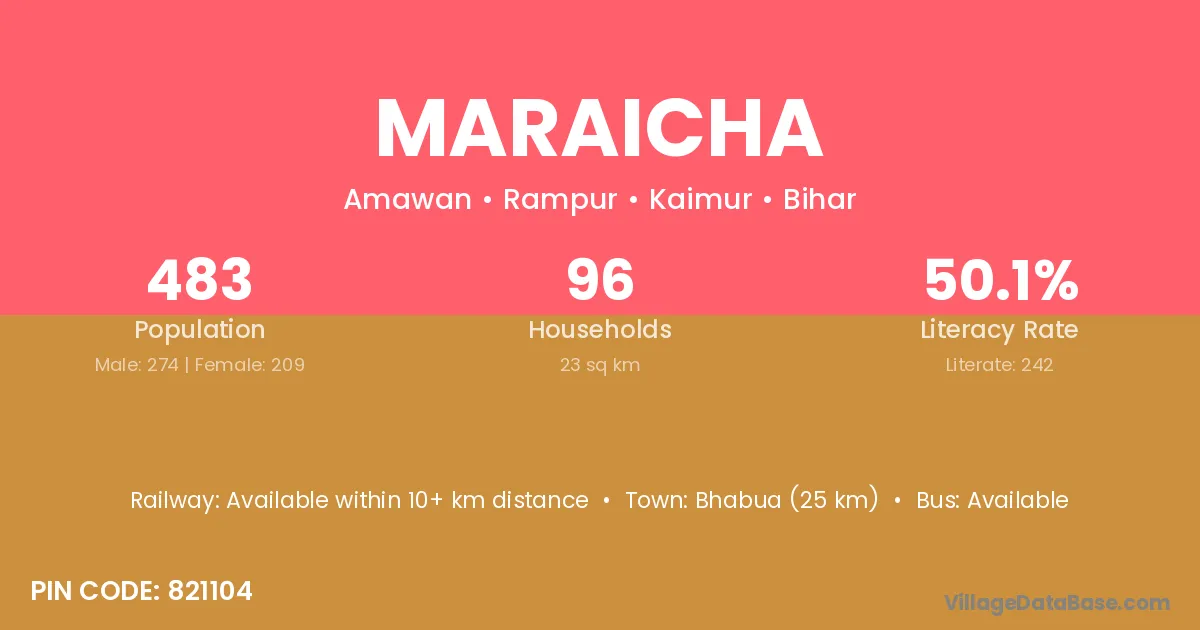 Bhabua (25 km) is the nearest town to Maraicha village for major economic activities and is located approximately 25 km away.