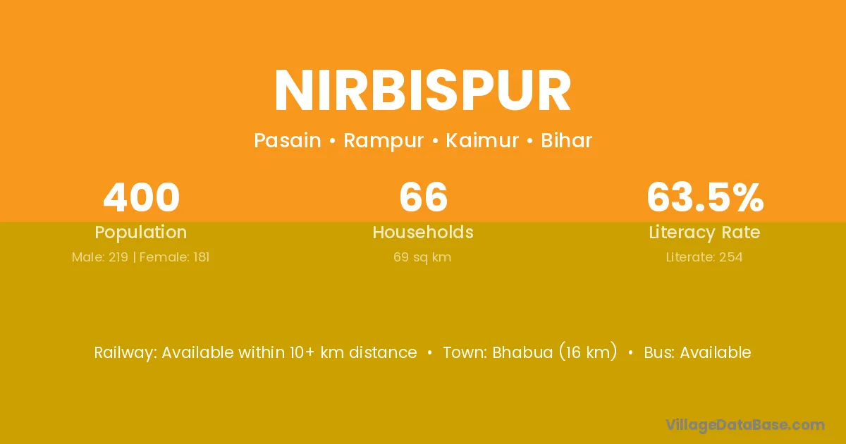 Bhabua (16 km) is the nearest town to Nirbispur village for major economic activities and is located approximately 16 km away.
