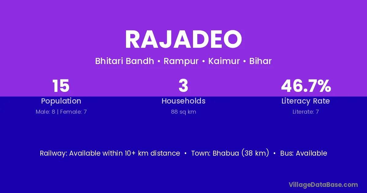 Bhabua (38 km) is the nearest town to Rajadeo village for major economic activities and is located approximately 38 km away.