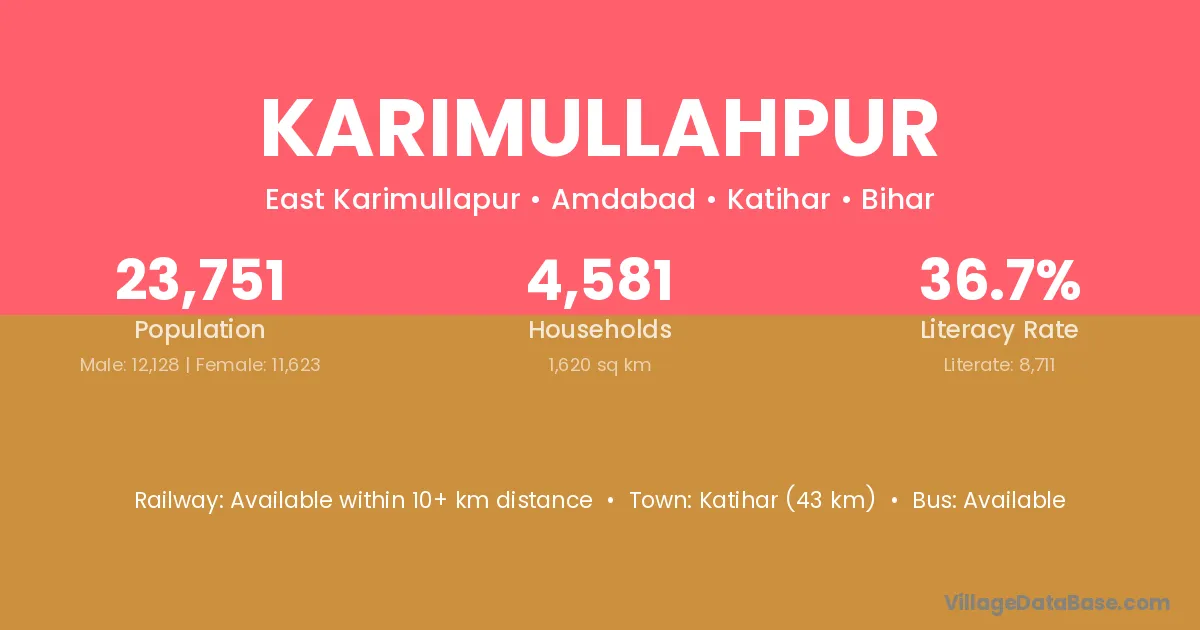 Katihar (43 km) is the nearest town to Karimullahpur village for major economic activities and is located approximately 43 km away.