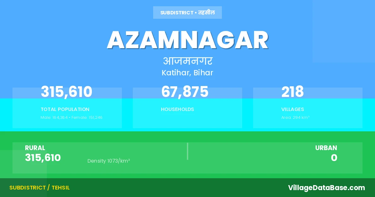 Azamnagar is a town and Subdivision in the Katihar district of the Bihar. In India, a Subdivision is a subdivision of a district responsible for the administration and revenue collection of a specific area within the district. Subdivisions play a crucial role in the local governance structure, contributing significantly to the development and administration of their communities.