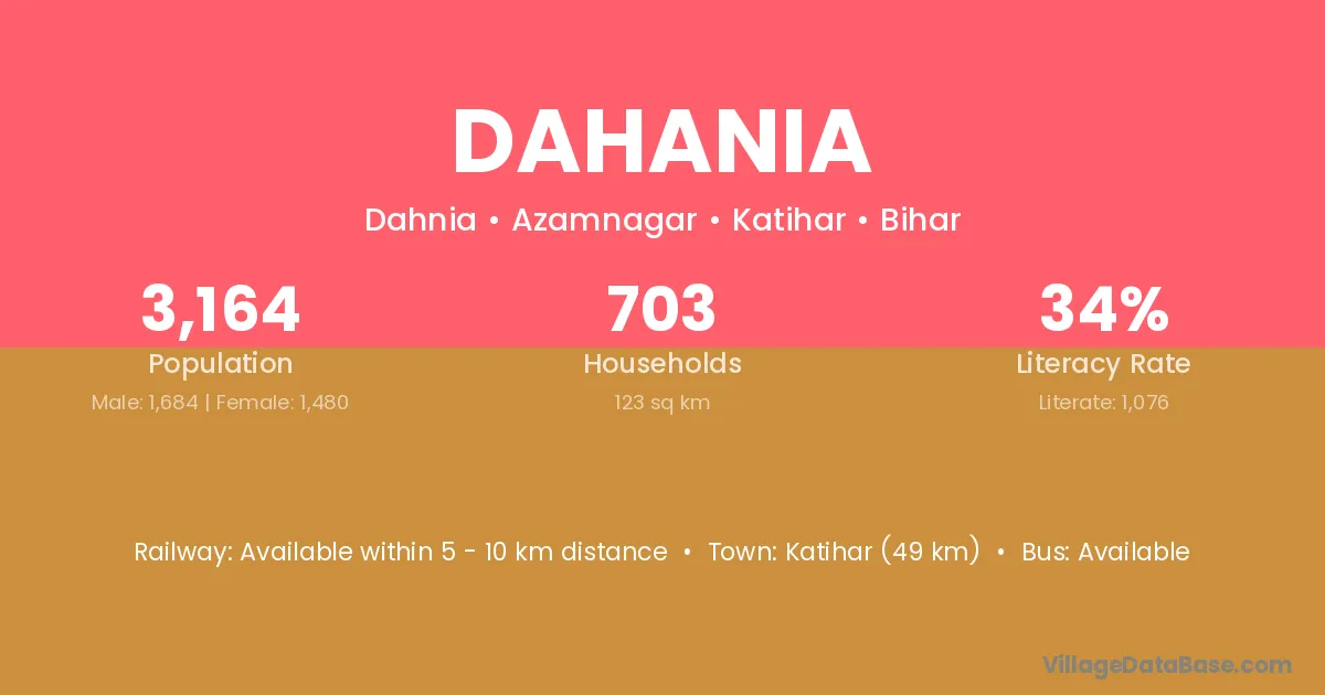 Katihar (49 km) is the nearest town to Dahania village for major economic activities and is located approximately 49 km away.