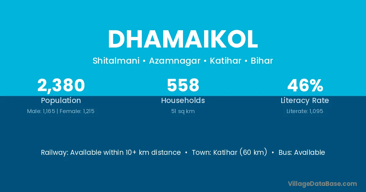 Katihar (60 km) is the nearest town to Dhamaikol village for major economic activities and is located approximately 60 km away.