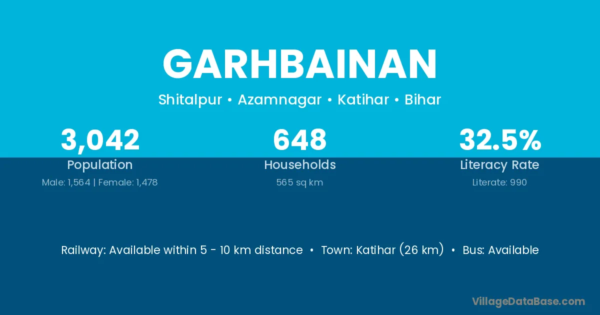Katihar (26 km) is the nearest town to Garhbainan village for major economic activities and is located approximately 26 km away.