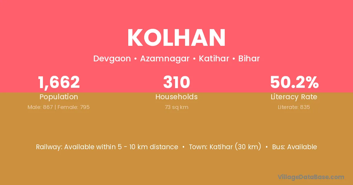 Katihar (30 km) is the nearest town to Kolhan village for major economic activities and is located approximately 30 km away.