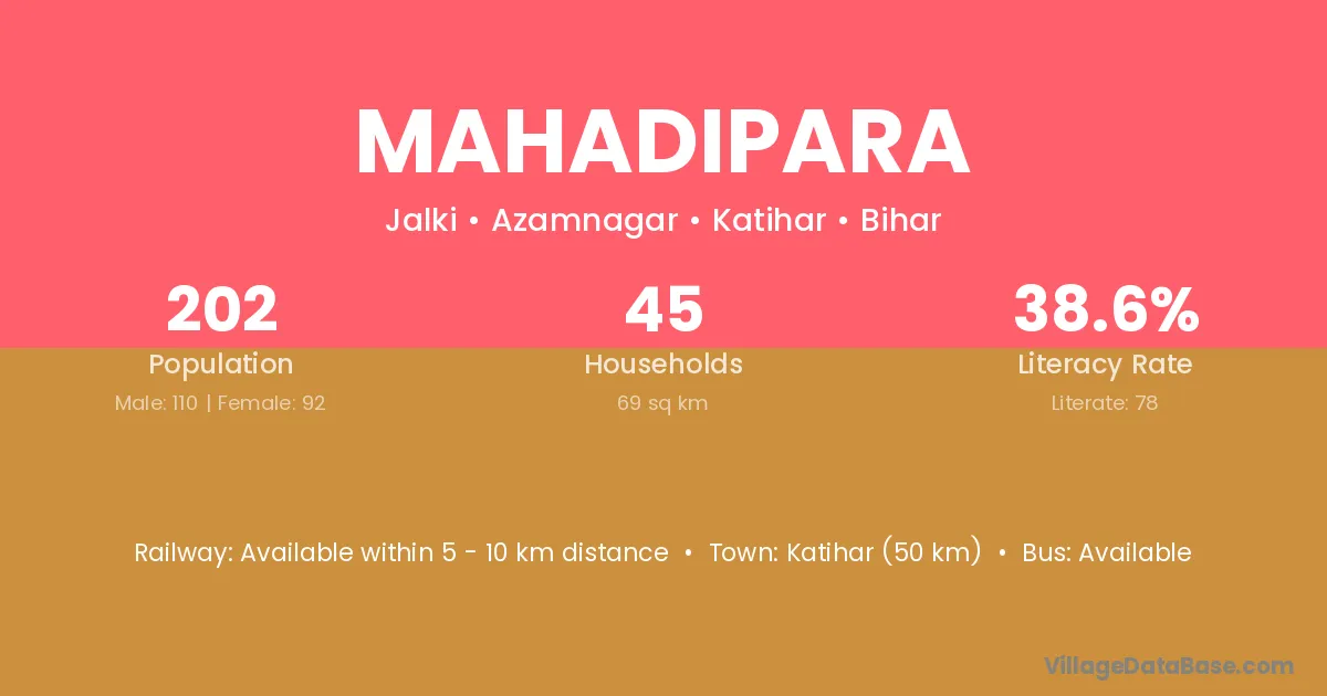 Katihar (50 km) is the nearest town to Mahadipara village for major economic activities and is located approximately 50 km away.