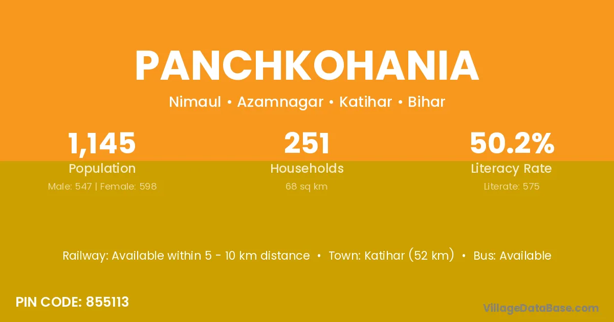 Katihar (52 km) is the nearest town to Panchkohania village for major economic activities and is located approximately 52 km away.