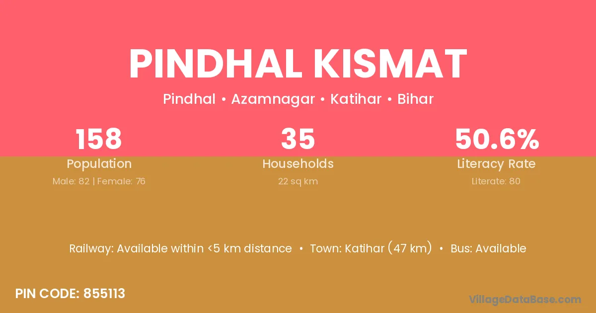 Katihar (47 km) is the nearest town to Pindhal Kismat village for major economic activities and is located approximately 47 km away.