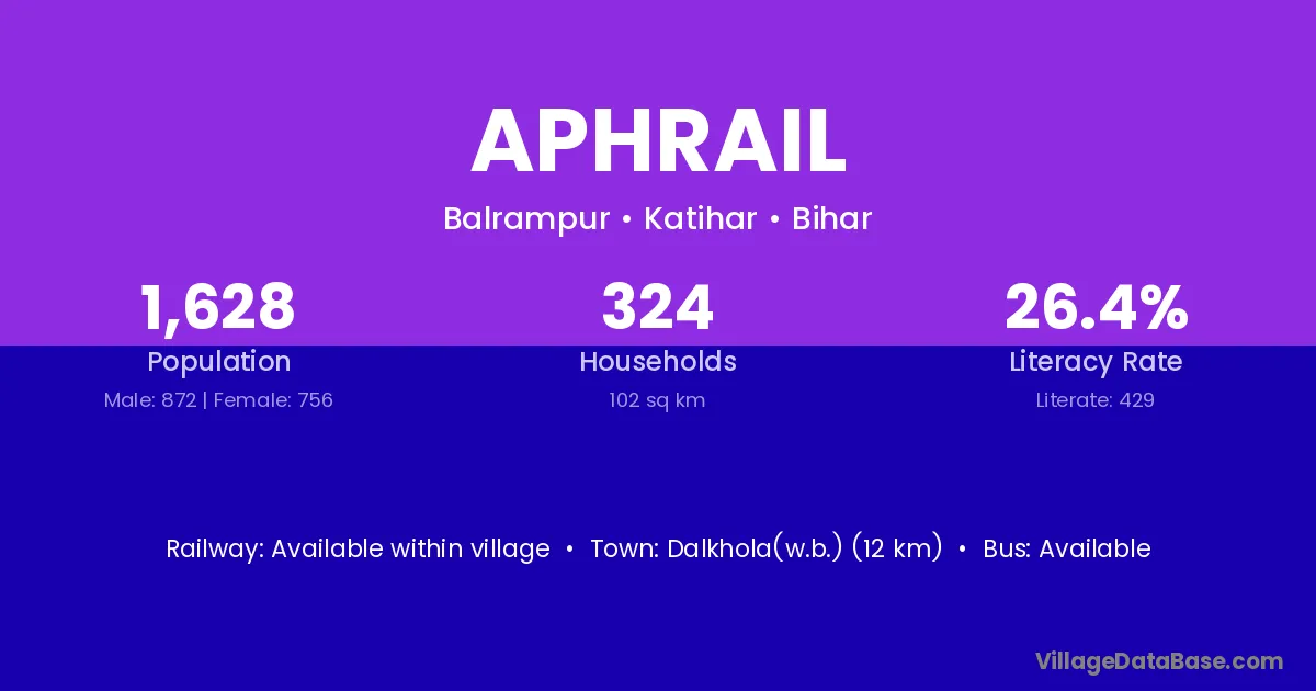 Dalkhola(w.b.) (12 km) is the nearest town to Aphrail village for major economic activities and is located approximately 12 km away.