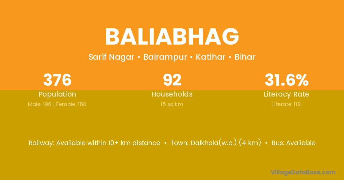 Dalkhola(w.b.) (4 km) is the nearest town to Baliabhag village for major economic activities and is located approximately 4 km away.