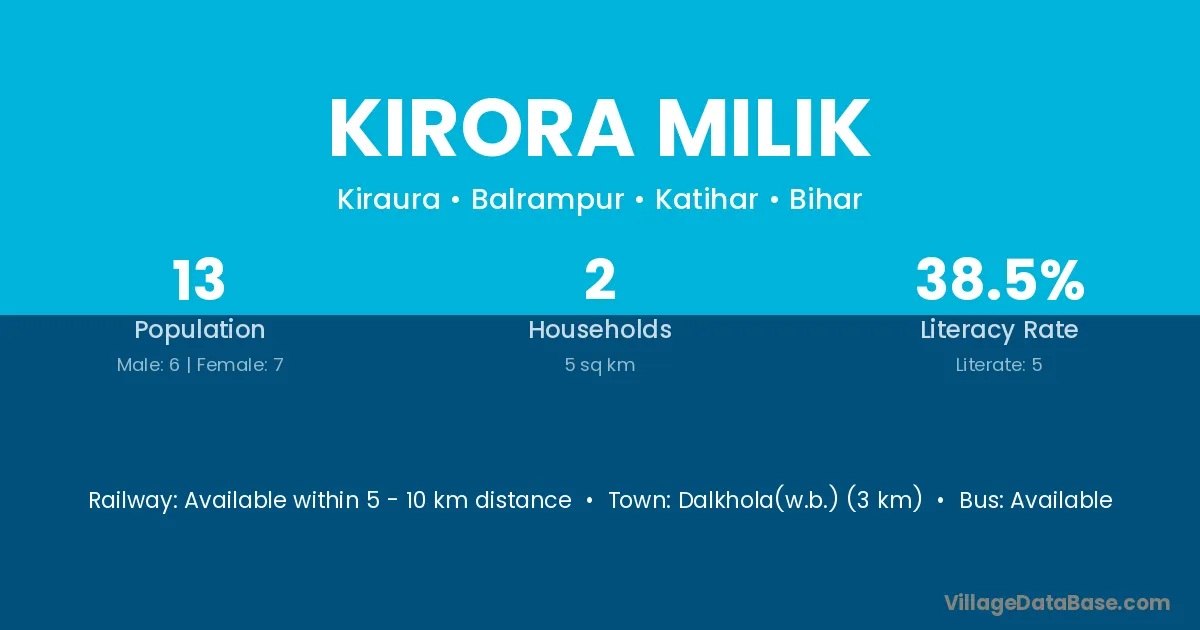 Dalkhola(w.b.) (3 km) is the nearest town to Kirora Milik village for major economic activities and is located approximately 3 km away.