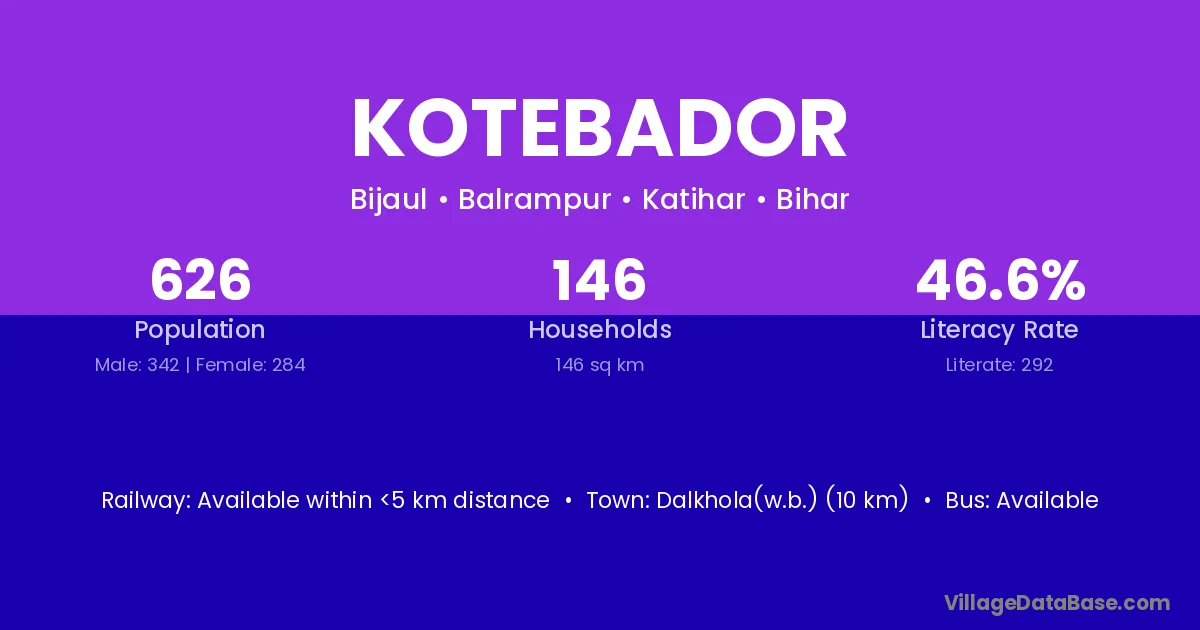 Dalkhola(w.b.) (10 km) is the nearest town to Kotebador village for major economic activities and is located approximately 10 km away.