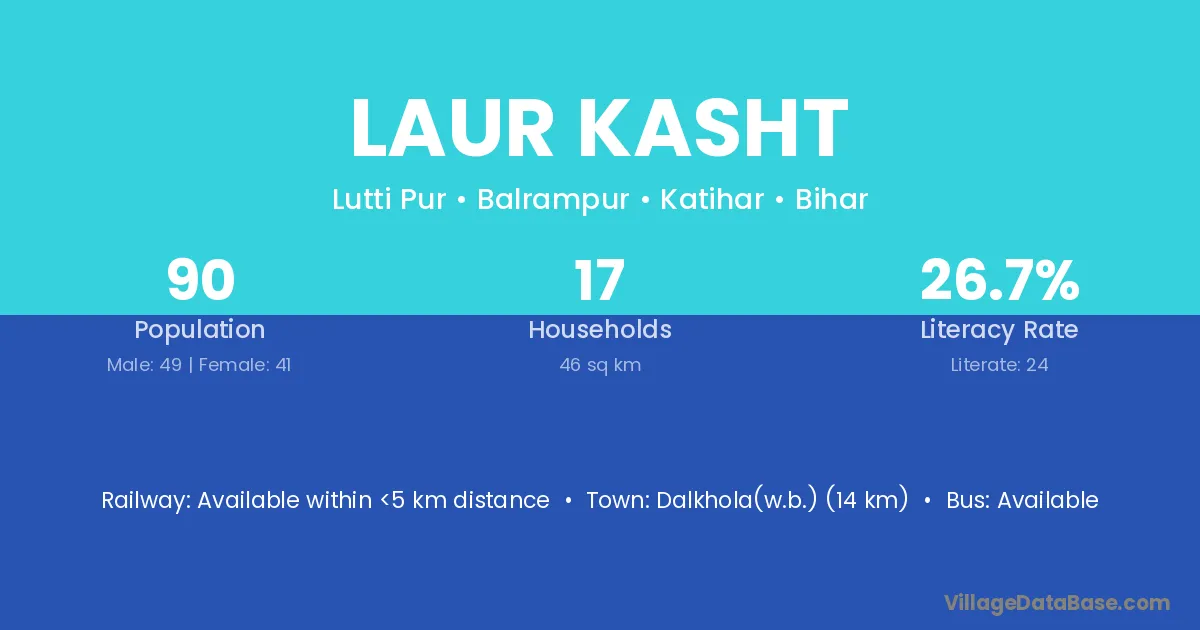 Dalkhola(w.b.) (14 km) is the nearest town to Laur Kasht village for major economic activities and is located approximately 14 km away.
