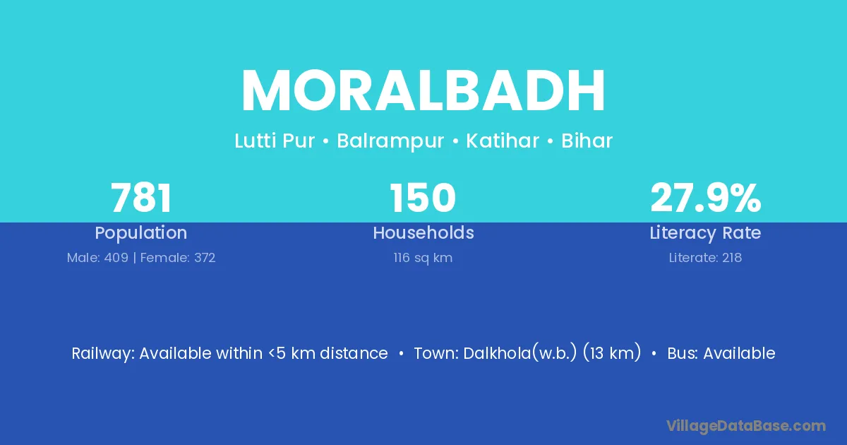 Dalkhola(w.b.) (13 km) is the nearest town to Moralbadh village for major economic activities and is located approximately 13 km away.