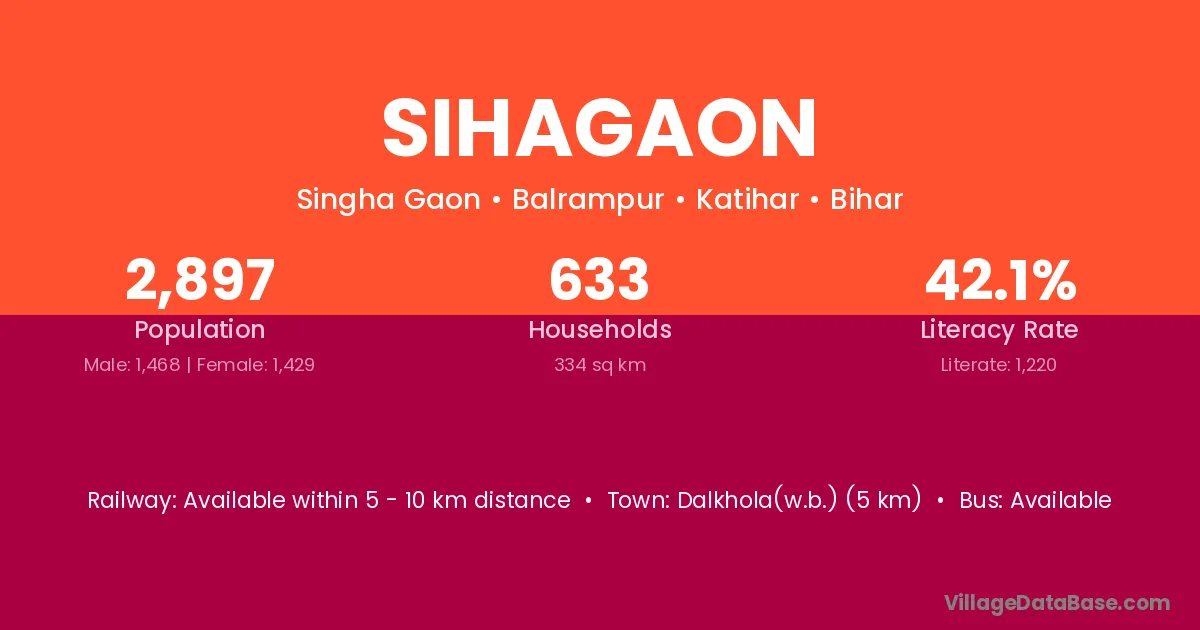 Dalkhola(w.b.) (5 km) is the nearest town to Sihagaon village for major economic activities and is located approximately 5 km away.