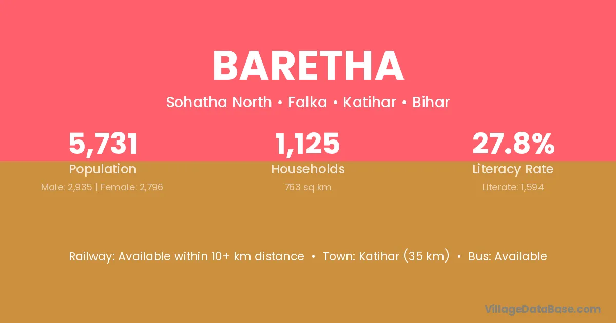 Katihar (13 km) is the nearest town to Baretha village for major economic activities and is located approximately 13 km away.