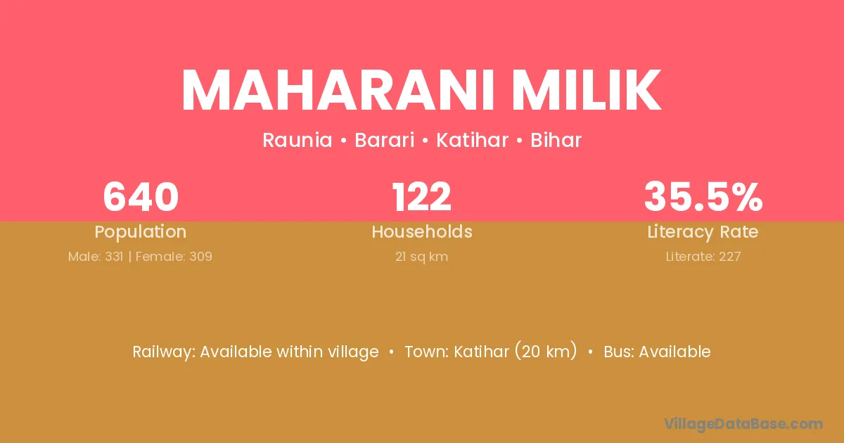 Katihar (20 km) is the nearest town to Maharani Milik village for major economic activities and is located approximately 20 km away.