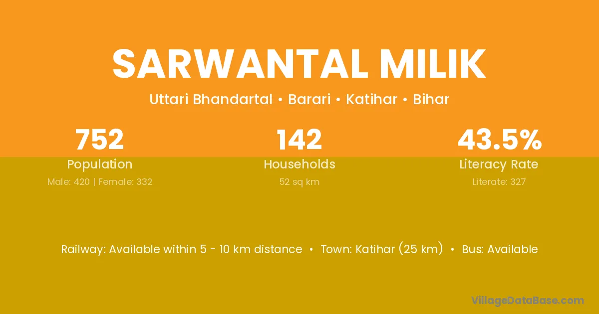 Katihar (25 km) is the nearest town to Sarwantal Milik village for major economic activities and is located approximately 25 km away.
