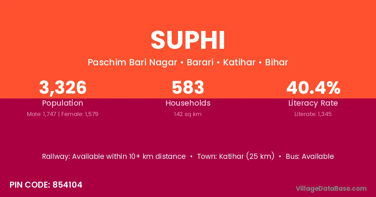 Katihar (25 km) is the nearest town to Suphi village for major economic activities and is located approximately 25 km away.
