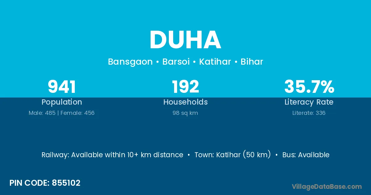 Katihar (50 km) is the nearest town to Duha village for major economic activities and is located approximately 50 km away.