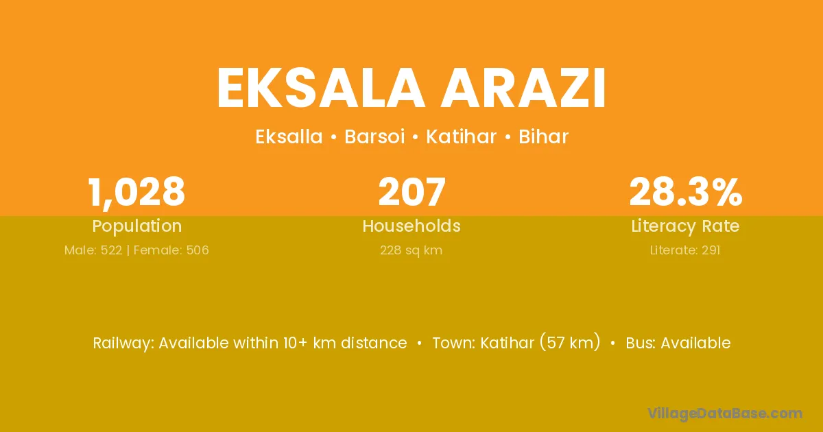 Katihar (57 km) is the nearest town to Eksala Arazi village for major economic activities and is located approximately 57 km away.