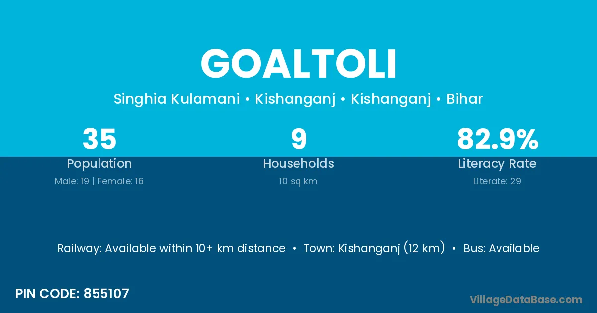 Katihar (50 km) is the nearest town to Goaltoli village for major economic activities and is located approximately 50 km away.
