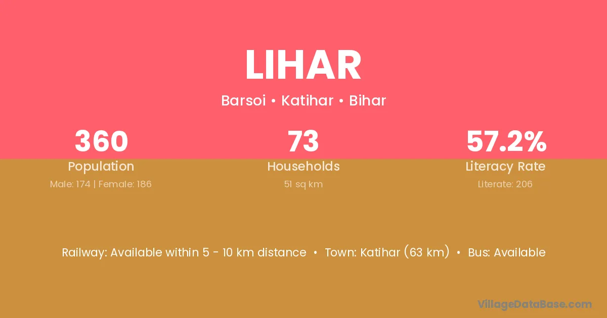 Katihar (63 km) is the nearest town to Lihar village for major economic activities and is located approximately 63 km away.