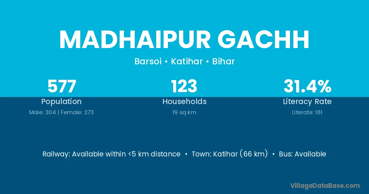 Katihar (66 km) is the nearest town to Madhaipur Gachh village for major economic activities and is located approximately 66 km away.