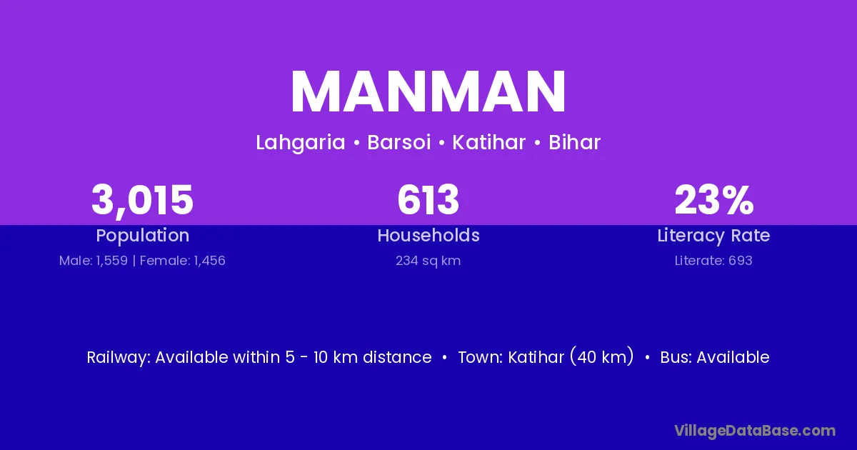 Katihar (40 km) is the nearest town to Manman village for major economic activities and is located approximately 40 km away.